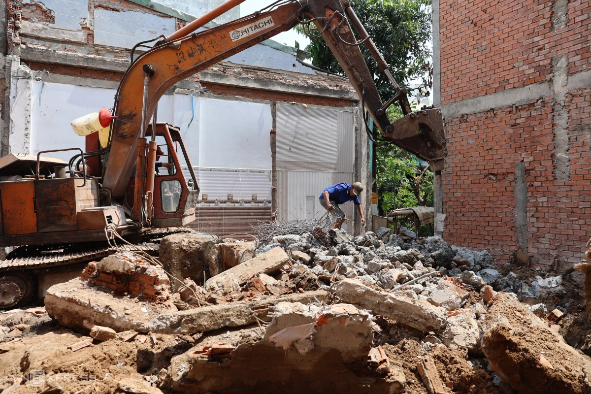 Tại căn nhà số 168, gạch đá, xà bần ngổn ngang sau khi tháo dỡ được công nhân thu dọn.