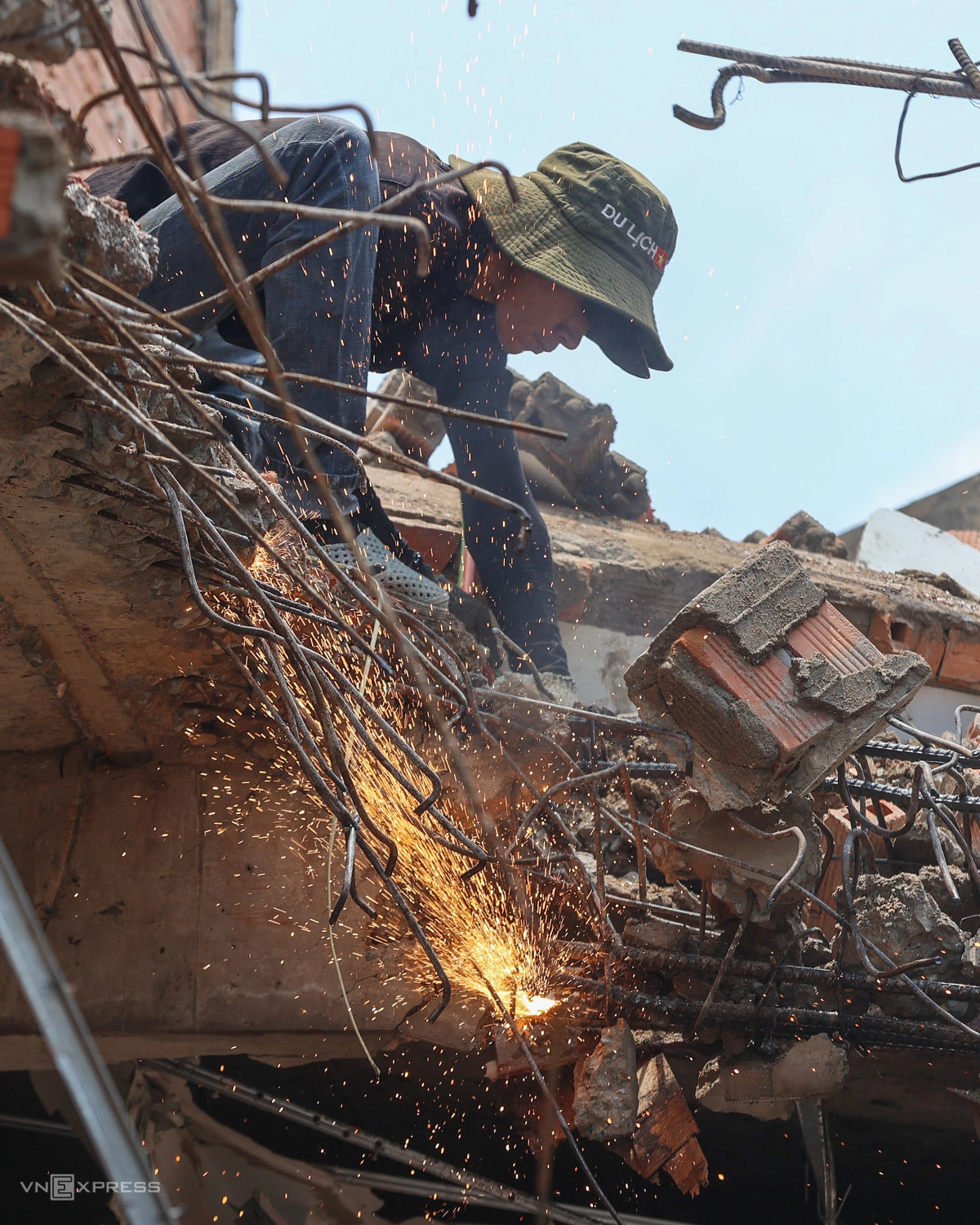 Các mảng tường sau khi kéo sập được công nhân cắt các kết cấu bên trong để lấy sắt thép.